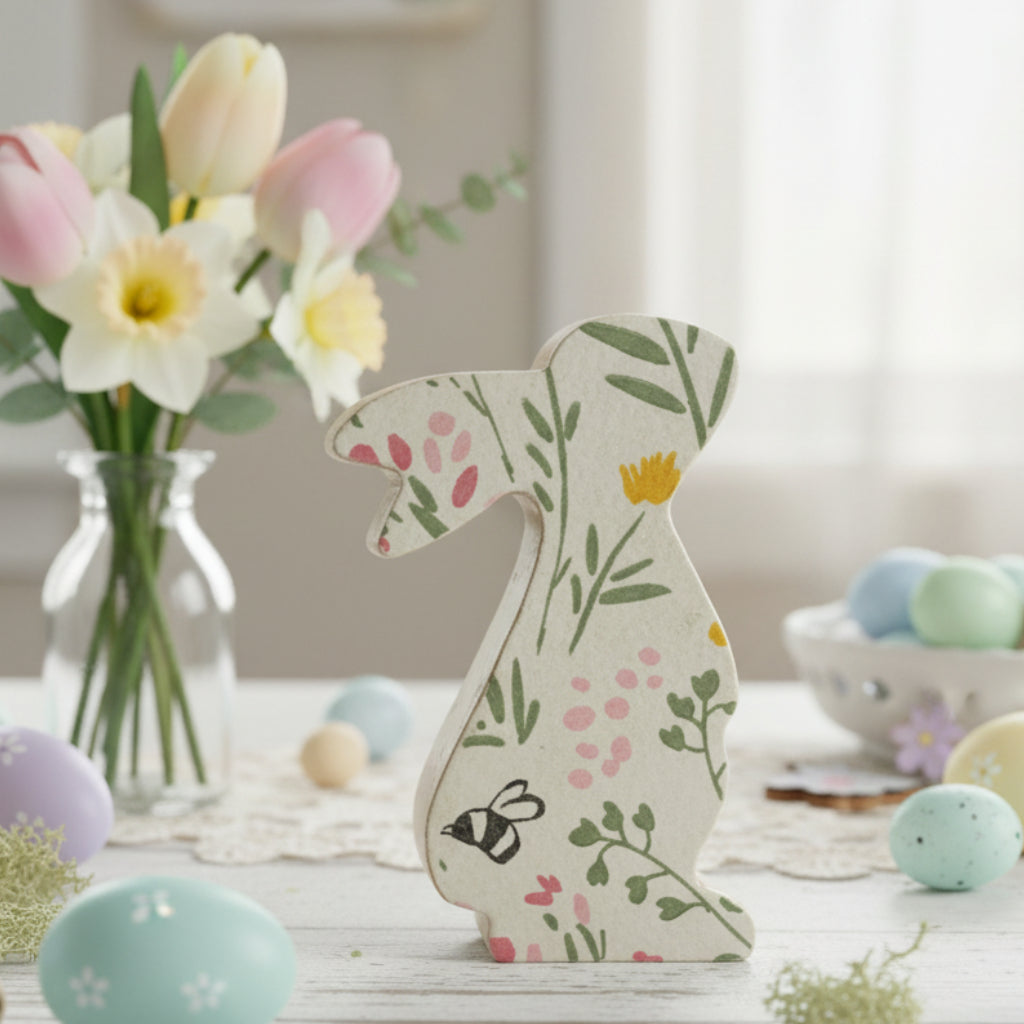 Bring springtime charm to your home with this delightful wooden bunny decoration. Standing 7" tall, this handcrafted piece features springtime tones on a classic bunny silhouette, perfect for Easter displays, shelf styling, or seasonal décor. Ideal for adding warmth and whimsy to any room, this versatile accent works beautifully in farmhouse, cottage, or modern interiors. A timeless addition to your Easter collection that celebrates the season with understated elegance.